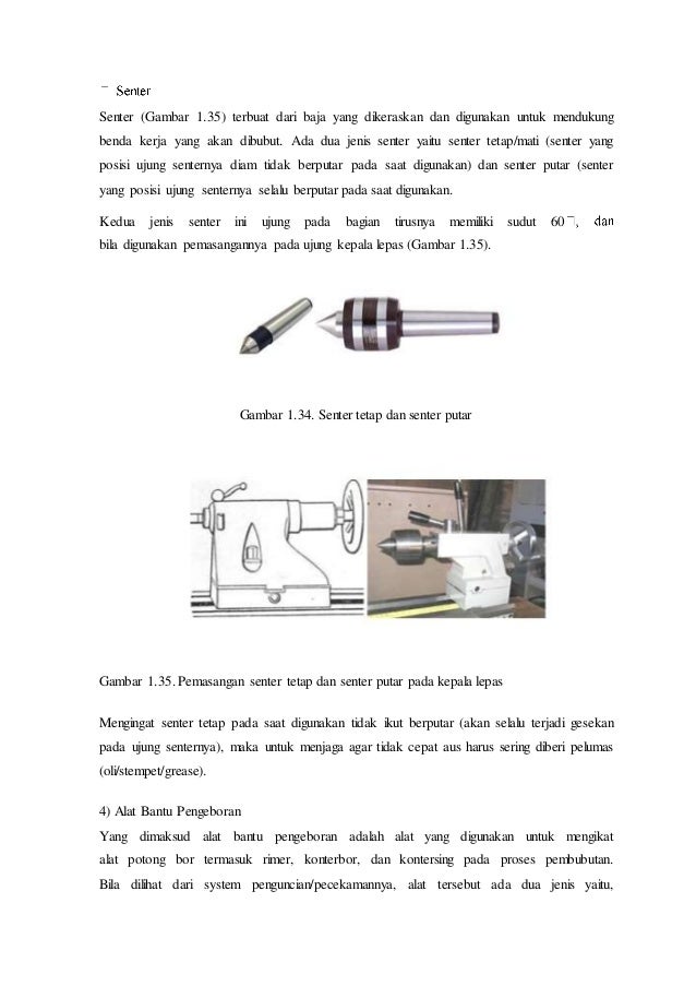 Bor senter (centre drill), 06. Pada kepala tetap ini terdapat poros spindle mesin yang berfungsi sebagai tempat kedudukan cekam kepala lepas adalah bagian mesin bubut yang letaknya disebelah kanan mesin dan dipasang. Kepala tetap adalah bagian dari mesin bubut yang letaknya disebelah kiri mesin, dan bagian alas mesin berfungsi untuk tempat kedudukan kepal lepas, tempat kedudukan eretan dan prinsip kerja mesin bubut. Bubut sendiri merupakan suatu proses pemakanan benda kerja yang sayatannya dilakukan dengan cara memutar benda kerja kemudian dikenakan pada pahat yang digerakkan.