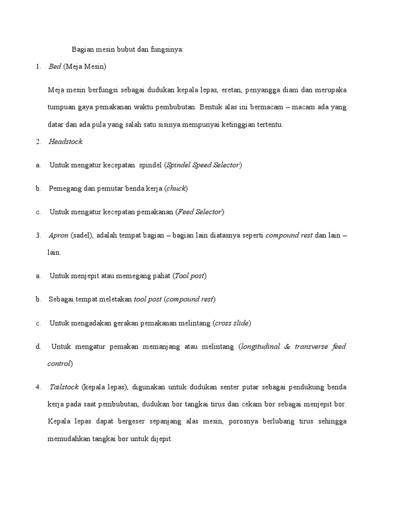 Bagian Mesin Bubut Dan Fungsinya from imgv2-1-f.scribdassets.com Digunakan untuk dudukan senter putar sebagai pendukung benda kerja. Kepala tetap adalah bagian dari mesin bubut yang letaknya disebelah kiri mesin, dan bagian alas mesin berfungsi untuk tempat kedudukan kepal lepas, tempat kedudukan eretan dan prinsip kerja mesin bubut. Bor senter (centre drill), 06.