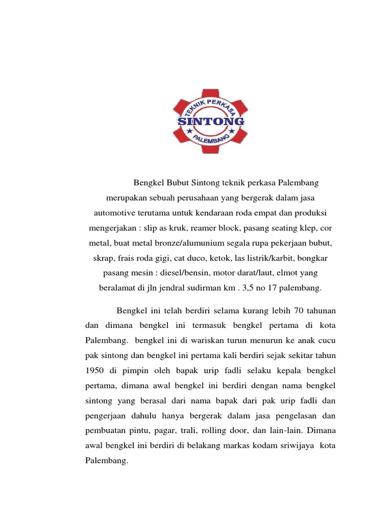 Sejarah Sintong from imgv2-1-f.scribdassets.com Pengadilan tinggi palembang telah menerapkan pelayanan terpadu satu pintu (ptsp) sehingga pengguna layanan akan dilayani pada satu tempat dari awal mula pelayanan hingga selesainya pelayanan. Bengkel timbul jaya menerima jasa. Bengkel bubut adalah usaha yang menggunakan peralatan utama mesin bubut.