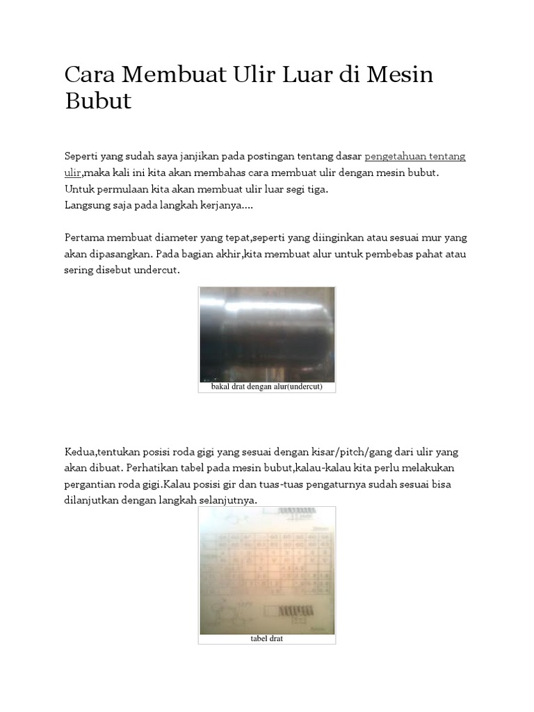 Mulailah dengan menyalakan mesin bubut serta menekan tuas otomatis drat untuk melakukan proses pemakanan benda kerja. Proses pembuatan ulir bisa dilakukan pada mesin bubut. Cara membuat bubut kayu menggunakan barang barang bekas di sekitar kita. Sebagai pedoman, anda perlu memperhatikan tabel pada mesin bubut, khususnya bila terpaksa harus mengganti roda giginya.