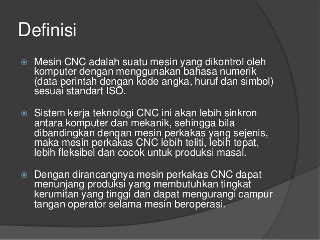 Mesin cnc atau computer numerical control adalah mesin kerja yang dikontrol melalui komputer.
