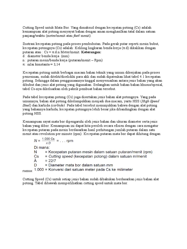 Parameter pemotongan pada proses pembubutan meliputi: Tuas pengatur kecepatan digunakan untuk mengatur kecepatan poros transporter dan sumbu pembawa. Untuk mengetahui kecepatan putar spindle utama, maka kita harus mengetahui kecepatan potong dari benda yang documents similar to tabel kecepatan potong mesin frais. Pengertian mesin bubut mesin bubut merupakan salah satu jenis mesin perkakas.