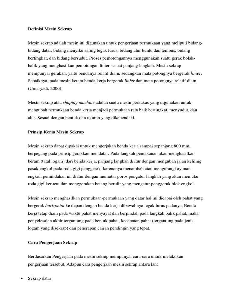 Mesin Sekrap Doc Document from static.fdokumen.com Siklus pendinginan absorbsi mirip dengan siklus pendinginan kompresi uap. Dengan mengatur perbandingan kecepatan rotasi benda kerja dan kecepatan translasi pahat maka akan diperoleh berbagai macam ulir dengan ukuran kisar yang berbeda. Posisi langkah dapat diatur dengan spindel posisi dan untuk mengatur panjang langkah dengan bantuan blok geser.