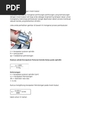 Teori Rumus Perhitungan Mesin Bubut from imgv2-2-f.scribdassets.com Bubut sendiri merupakan suatu proses pemakanan benda kerja yang sayatannya dilakukan dengan cara memutar benda kerja kemudian dikenakan pada pahat yang digerakkan. Kecepatan putaran mesin bubut adalah, kemampuan kecepatanputar mesin bubut untuk melakukan pemotongan atau penyayatan dalam satuanputaran/ menit. Prinsip kerjanya adalah benda kerja dicekam oleh chuck dan berputar sedangkan pahat potong bergerak maju untuk melakukan pemotongan dan pemakanan.
