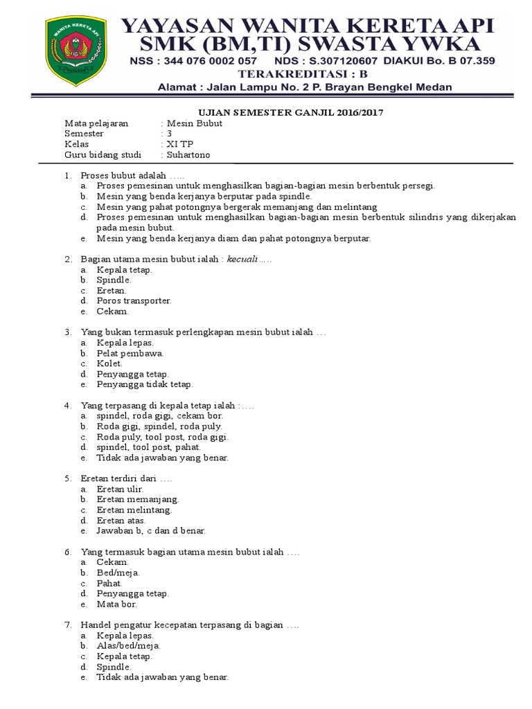Get Soal Dan Jawaban Mesin Bubut Kelas 11 Pics. Tempatkan tanda silang (x) di depan huruf a, b atau c sebelum jawaban yang benar! Contoh soal mesin bubut beserta jawabannya perbedaan cnc dan konvensional.