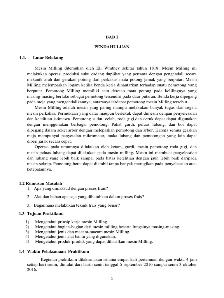 Bab I Pendahuluan 1 1 Latar Belakang from imgv2-1-f.scribdassets.com Tenaga untuk pemotongan berasal dari energi listrik yang diubah menjadi gerak. Dengan fungsinya tersebut, dapat dikatakan bahwa mesin menjadi salah satu bagian yang cukup penting di dalam sebuah mobil. Sedangkan, prinsip kerja mesin frais adalah dimana pisau frais bergerak berputar, sedang benda kerja terpasang pada meja dalam keadaan bergerak mendatar, tegak maupun berputar spindel utama, merupakan bagian yang terpenting dari mesin milling.