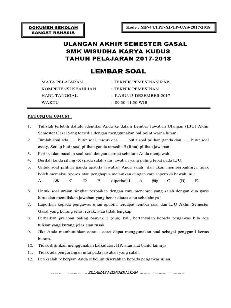 Background. 30 soal dan kunci jawaban uas gambar teknik mesin kurikulum 2013 teknik pemesinan. Bila ada pertanyaan seputar latihan soal diatas, bisa menuliskannya melalui kolom komentar di bawah post ini.