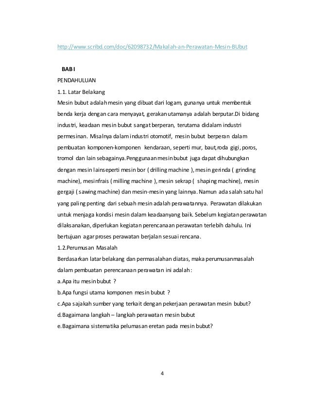 Pics. 0 ratings0% found this document useful (0 votes). Latar belakang masalah mesin bubut adalah mesin yang dibuat dari logam, gunanya di bidang industri, keadaan mesin bubut sangat berperan, terutama didalam industri permesinan.