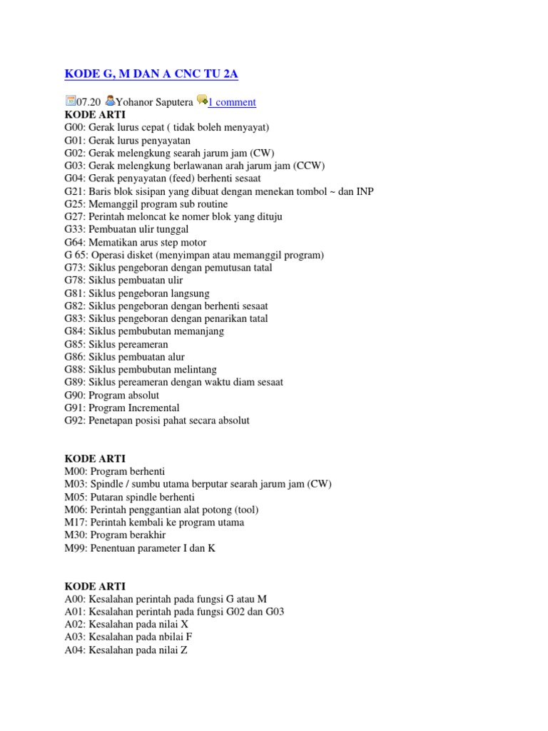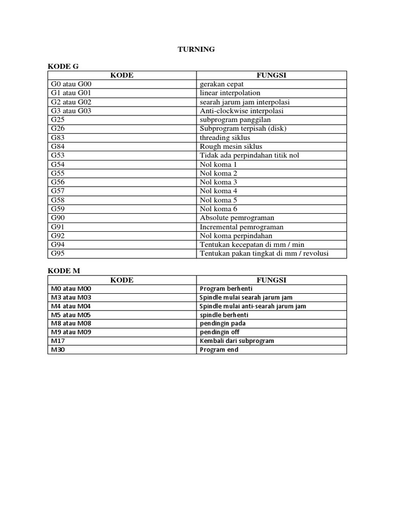 Membatalkan suatu fungsi pada mesin pada saat berjalan auto maupun manual. Apa yang dimaksud dengan program cnc? Gerakan penyayatan lurus, melintang dan tirus. Kode m biasanya berfungsi seperti sakelar atau untuk on/off spindel, coolant, atau menghentikan program.