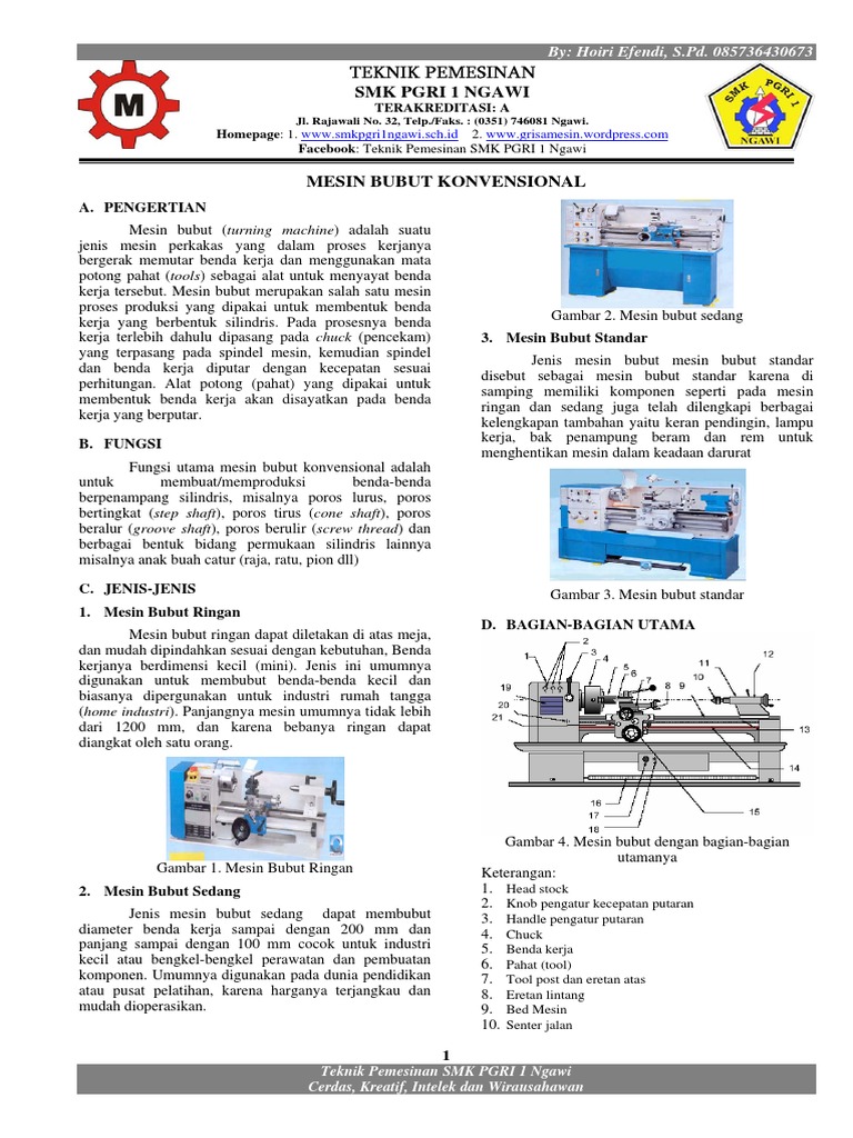 Bubut sendiri merupakan suatu proses pemakanan benda kerja yang sayatannya dilakukan dengan cara memutar benda kerja kemudian dikenakan pada pahat yang digerakkan. Fungsi setiap bagian tersebut secara simultan mendukung sobat mesin, ada 4 bagian utama mesin bubut yang perlu diketahui, seperti ditunjukkan pada gambar berikut ini. Mesin bubut terdiri dari meja (bed) dan kepala tetap (head stock). Bubut sendiri merupakan suatu proses.
